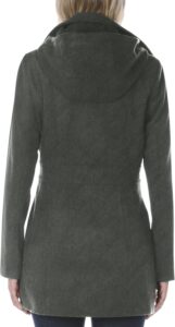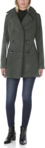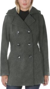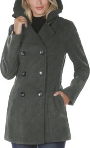This coat features a double-breasted peacoat design, a style known for its clean lines and enduring appeal. According to the manufacturer, the structured cut is intended to provide a flattering, true-to-size fit that works well over sweaters or layered outfits.
